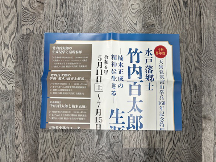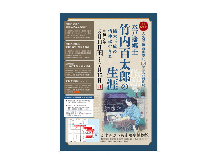 「竹内百太郎の生涯」を紹介する展覧会です。地元の歴史を知ることが出来るすばらしい展覧会です。右側には百太郎の挿絵とタイトルを大きく入れました。様々なイベントも開催されるので左側に内容をならべました。