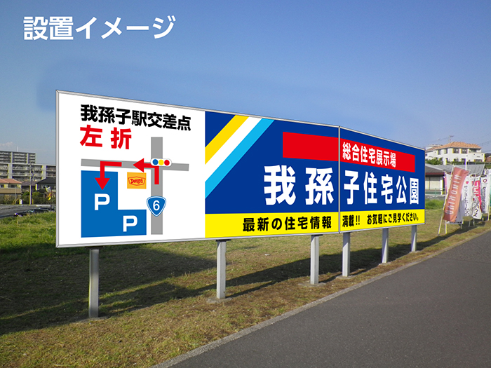 この看板は国道沿いにある看板で展示場の入口への誘導看板とPR看板として活躍しています。国道沿いのため上り車線からも下り車線からも見えるように真ん中から少し角度がついています。