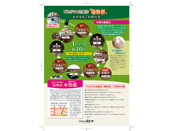 裏面デザインでは、緑を基調とし爽やかさを演出。表面との色彩対比により、温かさとリフレッシュ感の両立を表現しています。利用方法は「1サイクル約70分」というフローを円形にまとめ、視覚的に分かりやすく表現。効能や注意事項についても適切に整理し、初めての方でも安心して利用できるよう配慮しました。