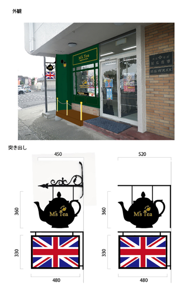 石岡市カフェ店舗内装企画設計デザイン(その32) カフェの外観が完成しましたので、完成報告しまーす♪まずは、図面から 製作前の完成イメージはこんな感じでした~ 実際に完成したのがこちら↓ ほぼイメージ通り完成してホッ!次は、店内の完成を報告いたしまーす♪