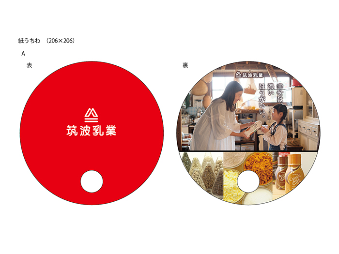 裏面は印象的な赤を全面に使用し、中央上部に「幸せは、淡いほうがいい。」というメッセージを配置。温もりのあるコピーとともに、製品群(牛乳・ヨーグルト・飲料・原料素材など)がアイコンのように円形で並べられ、視認性と統一感を両立しています。中央下には「TSUKUBA」ロゴが配置され、ブランドの存在感をしっかりとアピールしています。