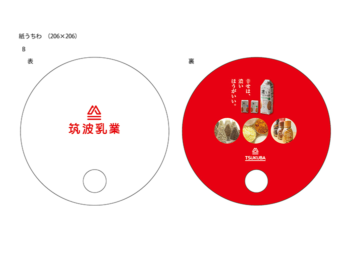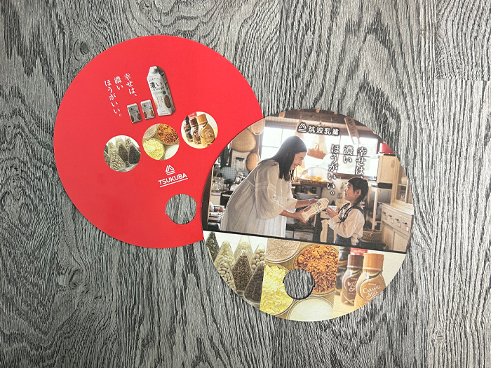 石岡市の乳製品加工会社様よりご依頼がありまして、紙製の丸うちわの作成をさせていただきました。サイズは直径206mmで、片手で持ちやすく、夏の販促アイテムとして大活躍です!