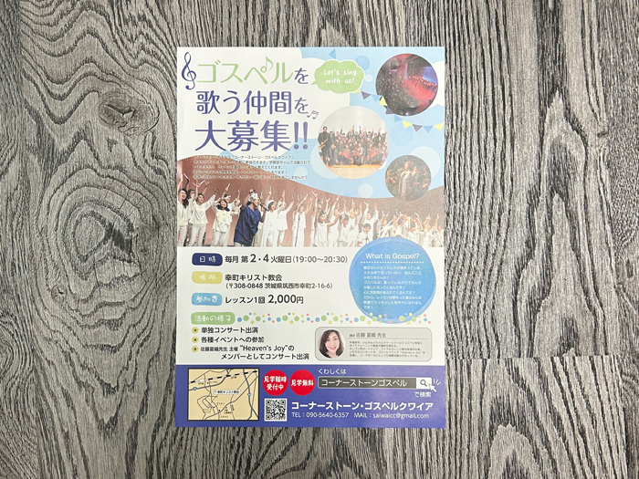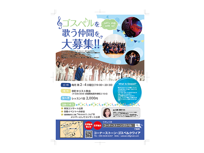 茨城県筑西市にあるキリスト教会様より、ゴスペルイベントのチラシ制作のご依頼をいただきました。今回のチラシは、ゴスペル合唱団の活動を広く知っていただくことを目的としています。